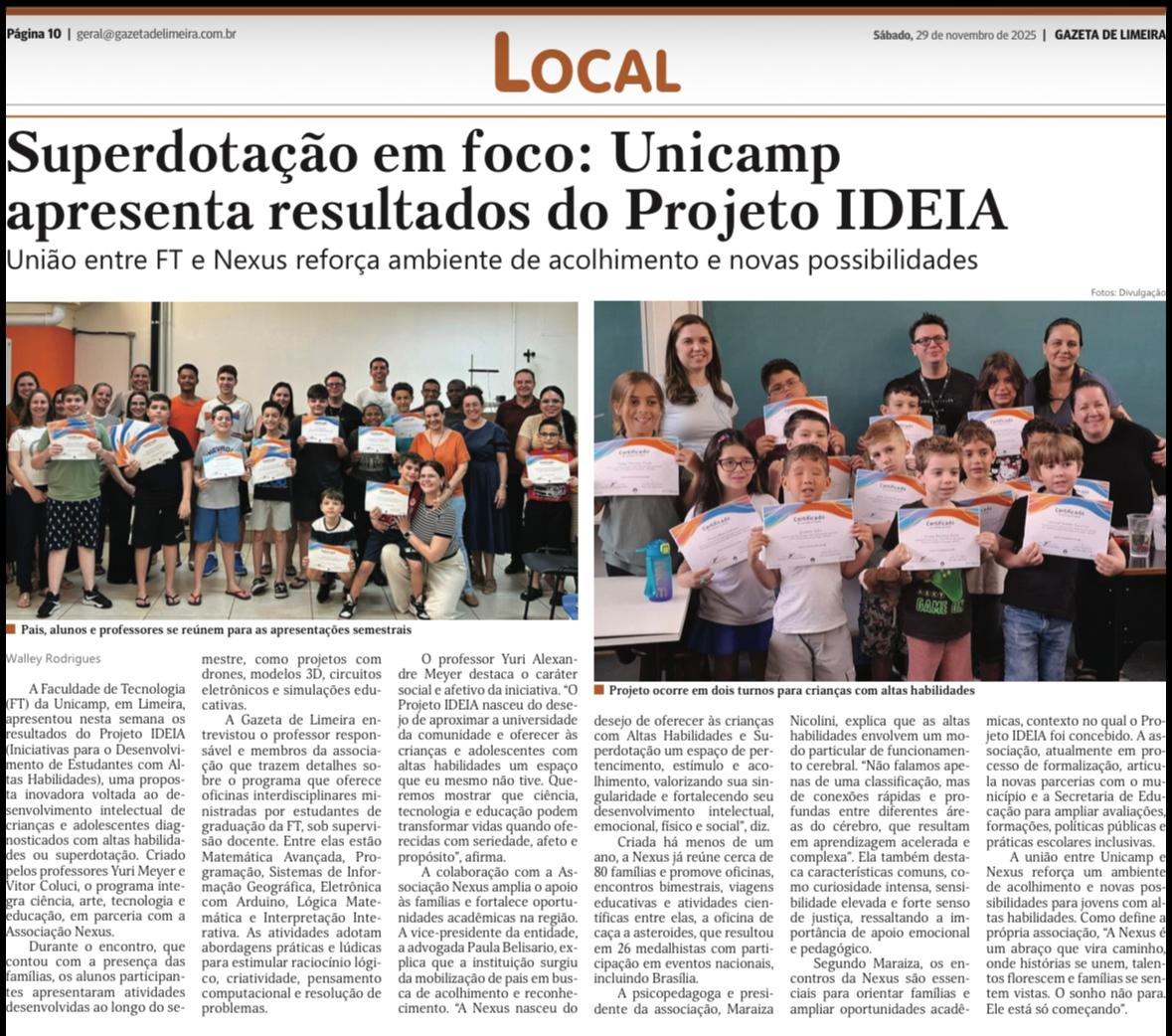 O Projeto IDEIA (Iniciativas para o Desenvolvimento de Estudantes com Altas Habilidades), desenvolvido pela Faculdade de Tecnologia (FT) da Unicamp em parceria com o Nexus – Associação Limeirense de Altas Habilidades, foi destaque na edição de sábado da Gazeta de Limeira. A reportagem, assinada pelo jornalista Walley Rodrigues (@wallrodrigues), apresentou os resultados das atividades do segundo semestre, que envolveram mais de 80 famílias e promoveram ações de acolhimento, desenvolvimento intelectual e estímulo à criatividade de crianças e adolescentes com altas habilidades.