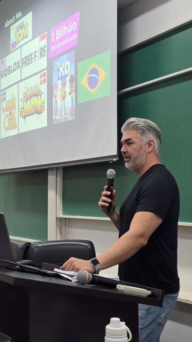 O destaque foi a participação de Charles Barros (https://www.linkedin.com/in/chazbarros/), CEO da Origin Games e fundador da Afterverse, ex-aluno de Sistemas de Informação (2003–2007). Criador do jogo PK XD, que ultrapassou a marca de um bilhão de usuários, Charles compartilhou sua trajetória no mercado de games, enfatizando a importância da iniciação científica e da graduação na consolidação de seu interesse pela área de desenvolvimento de jogos digitais.