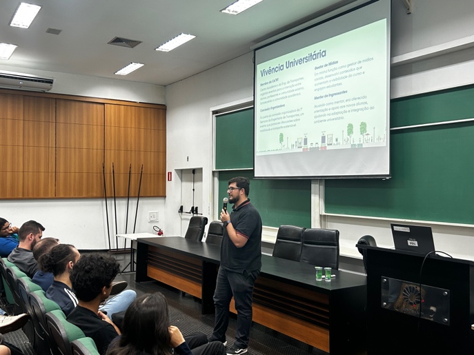 Encerrando o painel, o ex-aluno César Augusto Diniz (https://www.linkedin.com/in/cesaraugustoodiniz/), Engenheiro de Transportes (2021–2024) e atualmente cientista de dados da Tylin (Europe + LATAM), compartilhou sua vivência universitária, a participação no centro acadêmico e na iniciação científica, além de sua atuação em projetos de mobilidade sustentável, incluindo iniciativas como o Trem Intercidades.
